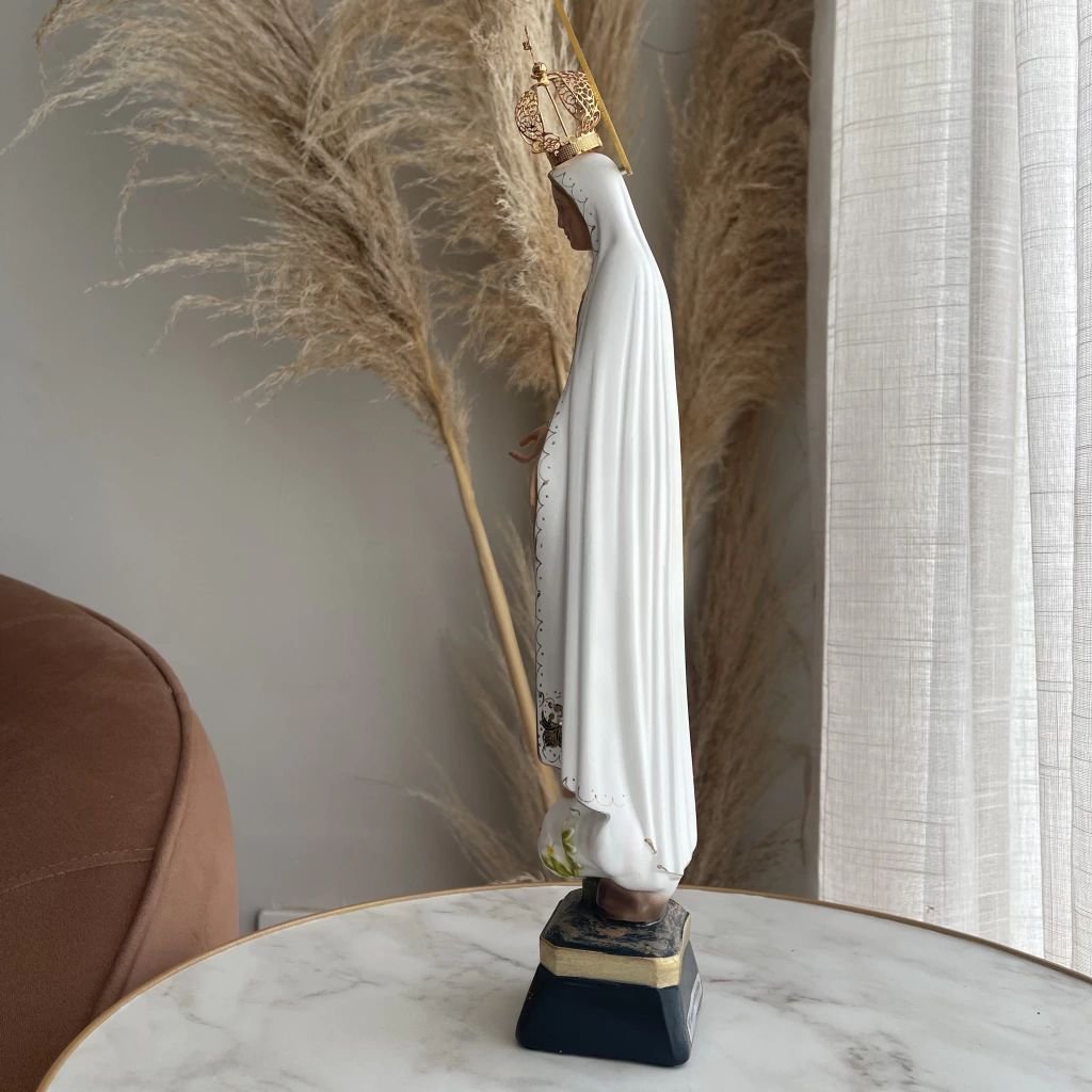 "Uma obra-prima de devoção: o Imaculado Coração de Fátima em resina, refletindo a pureza e a beleza da fé, com um acabamento de qualidade excepcional. Que este símbolo sagrado inspire e fortaleça os corações dos fiéis, lembrando-nos do amor maternal e da proteção divina de Nossa Senhora de Fátima."